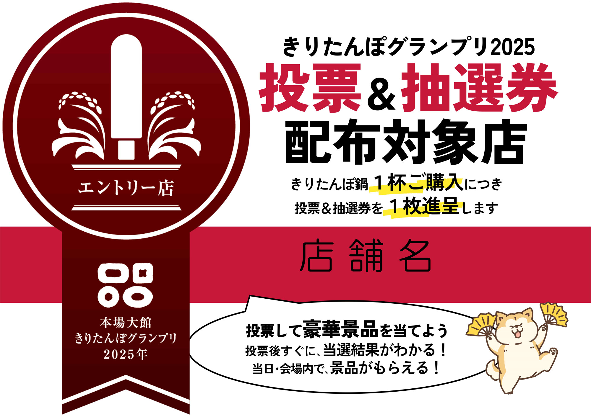 店頭に下記ポスターが掲示されているグランプリ参加店舗で「きりたんぽ鍋」を1杯購入すると、投票・抽選券(QRコード付き)が1枚もらえます。(ファストたんぽご購入時は4枚進呈)